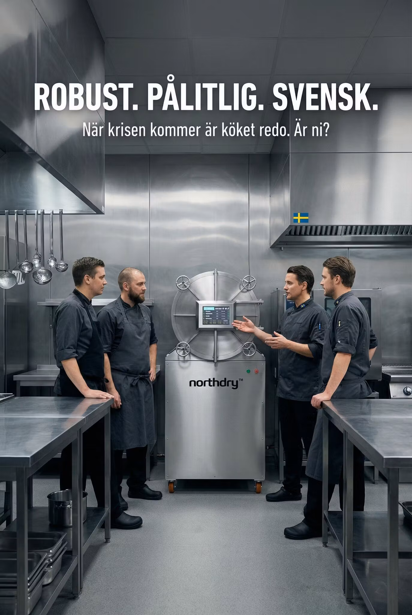 Northdry Government (G-Serien) är den produkt som är mest lämpad till försörjningsberedskap inom en komun, landsting och regioner av dom alternativ som finns på marknaden idag. Eftersom den är speciellt utvecklad för att fystorka färdiglagad mat (även svinn och matrester). Eftersom Svenska Northlink har satt upp kravspecen tillsammans kommunerna som dom har jobbat med när det gäller försörjningsberedskap, så är Northdry government serien dom enda frystorken som infriar alla Svenska för kommuner, regioner, sjukhus, skolor och militär.
