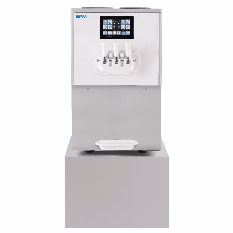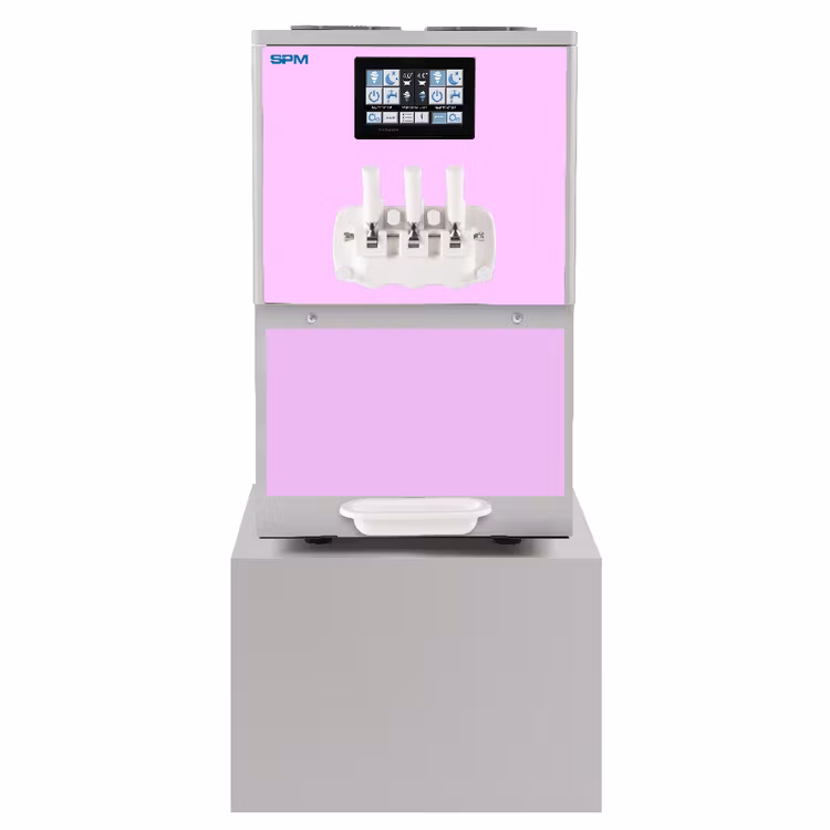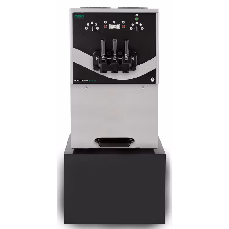 Detta är en väldigt stor mjukglassmaskin med dubbla smaker och ett handtag för mixad smak. Den har automatisk rengöring men ingen pastörisering. Man bör tömma maskinen och rengöra den en gång per vecka (beroende på vad man kör för mjukglass). Mjukglassmaskiner med automatisk pastörisering i den här storleksklassen ligger på ca 230000kr och uppåt. Automatisk pastörisering användes mest av bensinmackar 7 eleven mm, där man inte kan koll på glassen. Dock ska man veta att pastöriseringsprocessen påverkar glassen vad det gäller smak och färg negativt. Man bör bara pastörisera en glass 2 ggr och denna process bör inte göras oftare än var tredje dag (beror givetvis på hur mycket glass man serverar).